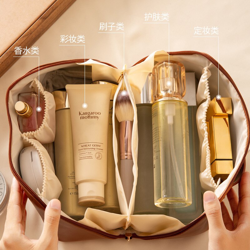 Say goodbye to the chaos of digging through your makeup essentials in a cluttered bag. Inside, you'll find multiple compartments, pockets, and slots tailored to accommodate all your cosmetics, skincare, and toiletries. From lipstick to brushes, from moisturizers to compacts, this bag keeps everything in its place, ensuring you're always ready to look your best.